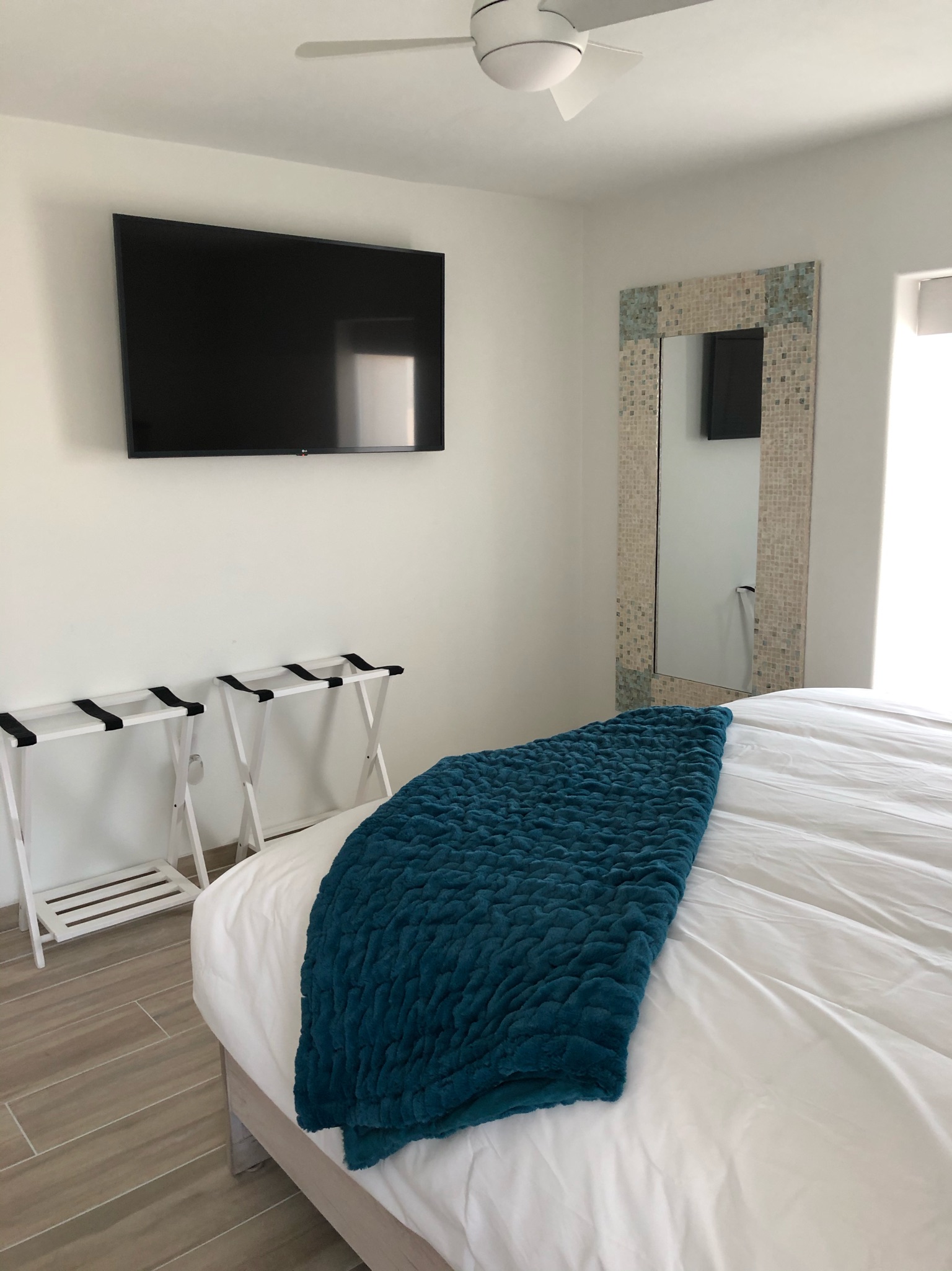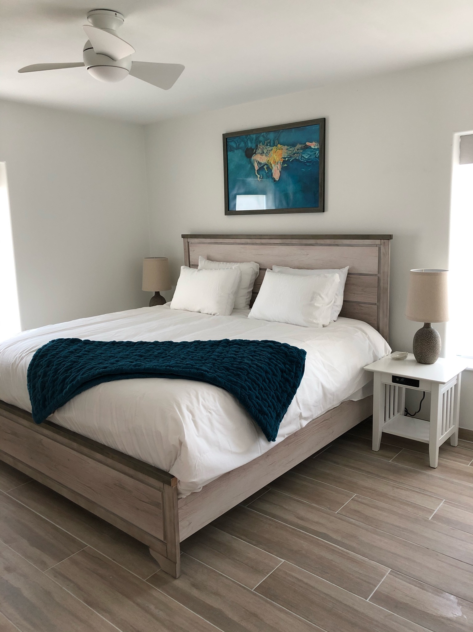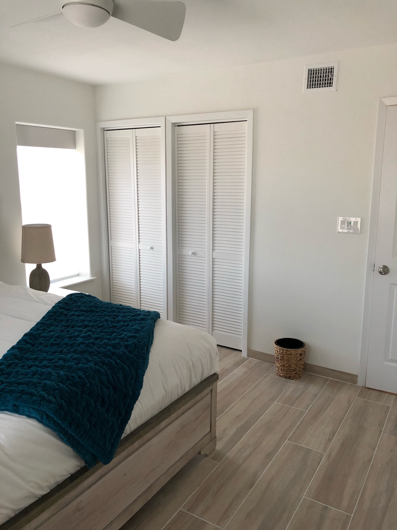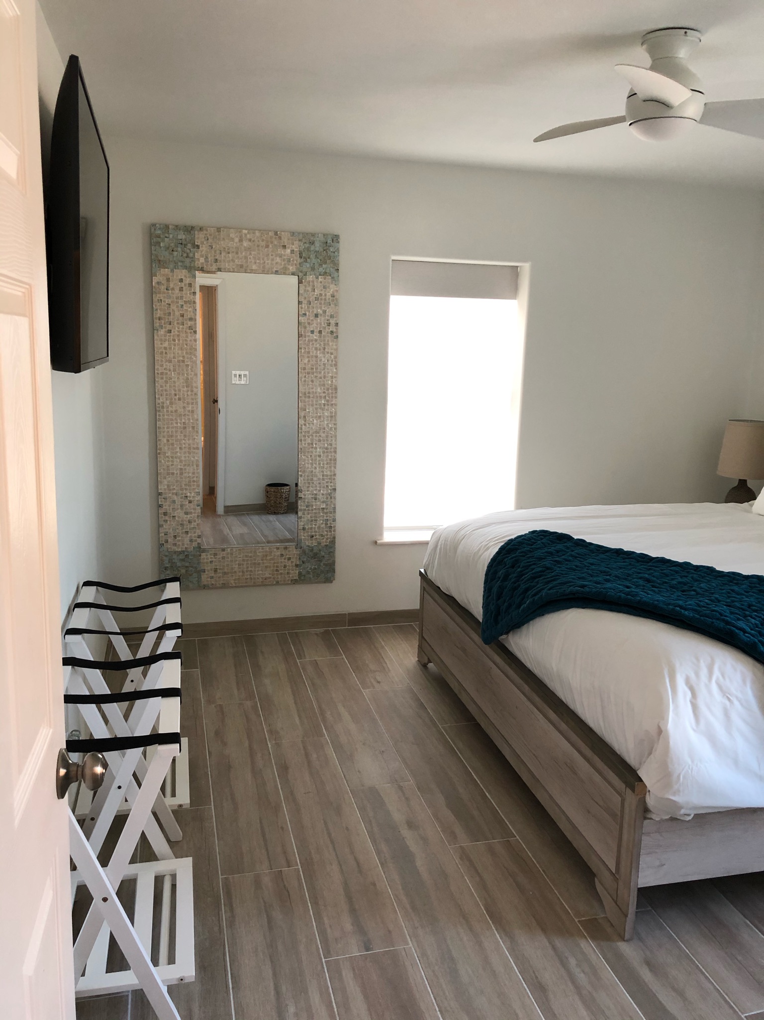 A beautiful, custom-tiled mirror accents the room with room-darkening shades and amenities including a 55″ LG Smart TV, ceiling fan, nightstands that include a convenient USB and 110V plugs for easy access to plugging in your electronics. Guests in the 2nd bedroom also have ample closet space for handing clothes and storing items.