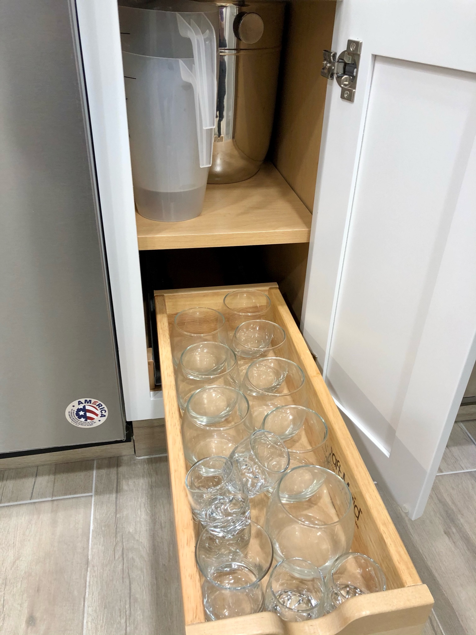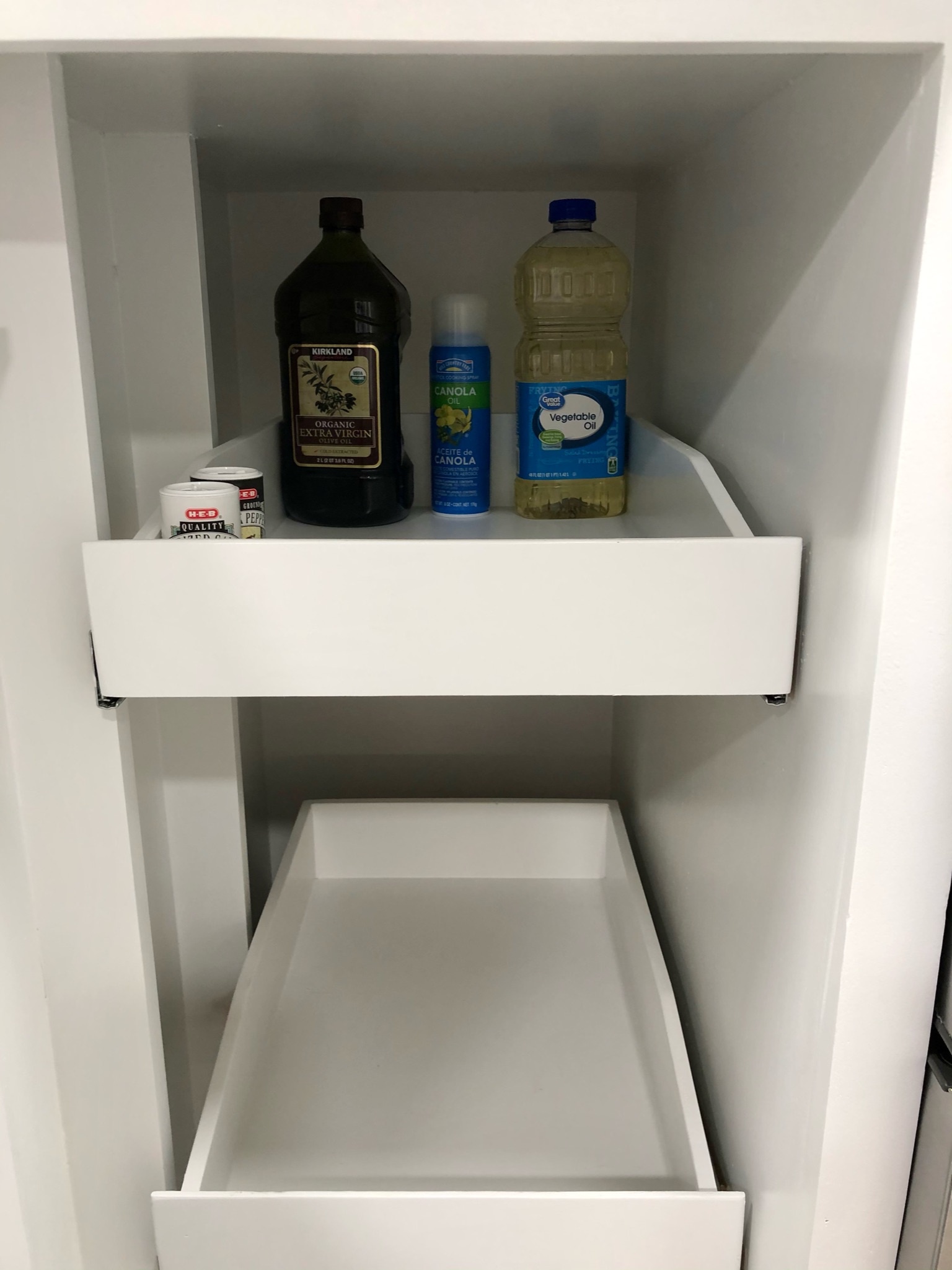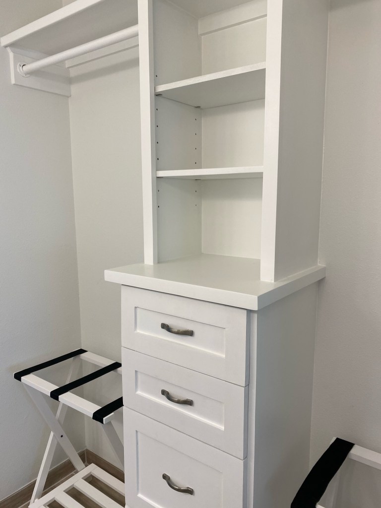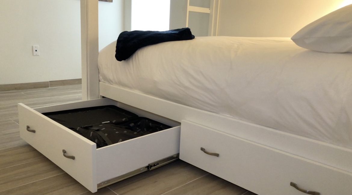 A custom cabinet drawer for storage, along with 4-customized pull-out drawers that were each designed to hold an entire Away Carry-on Suitcase for maximizing guest storage.