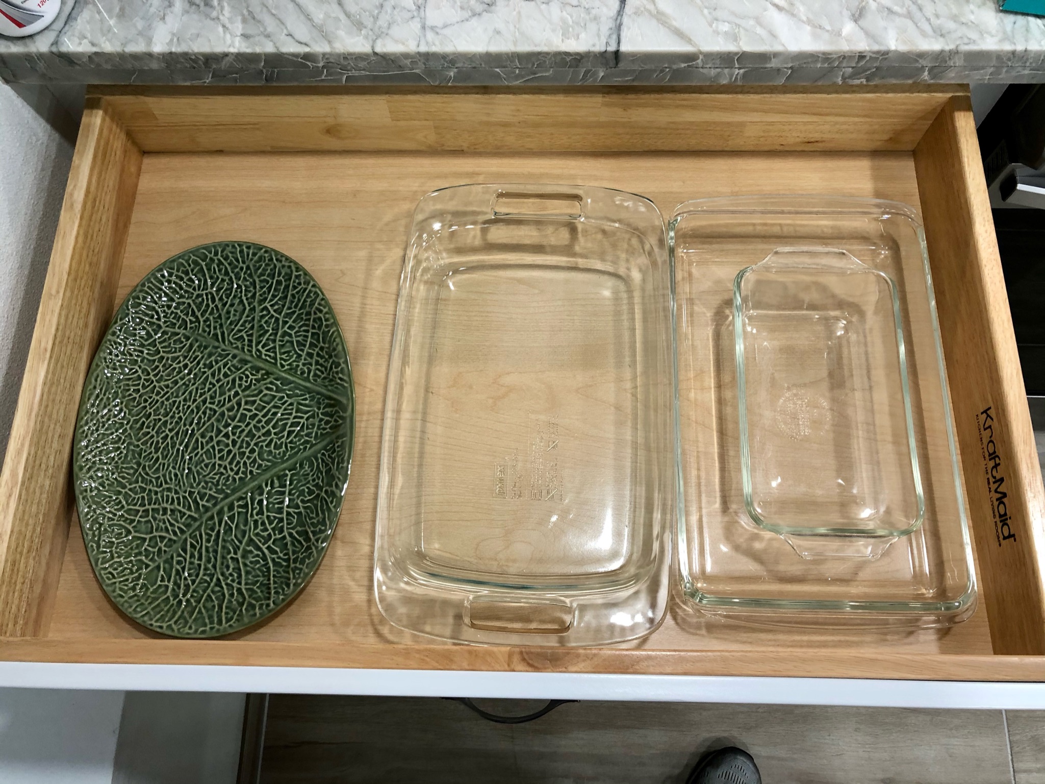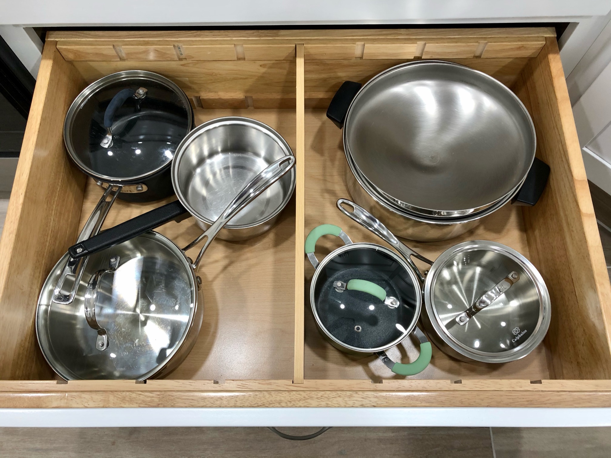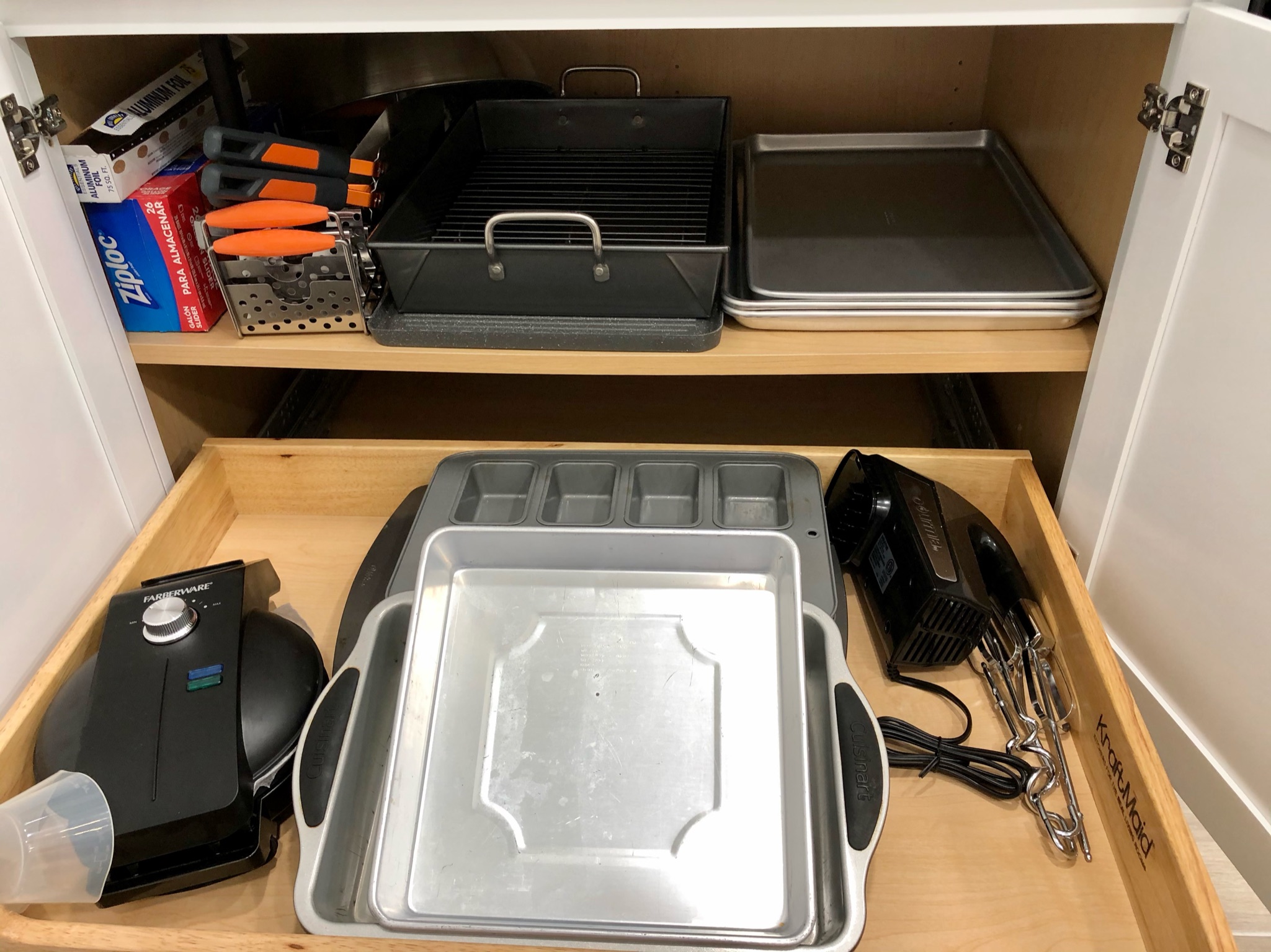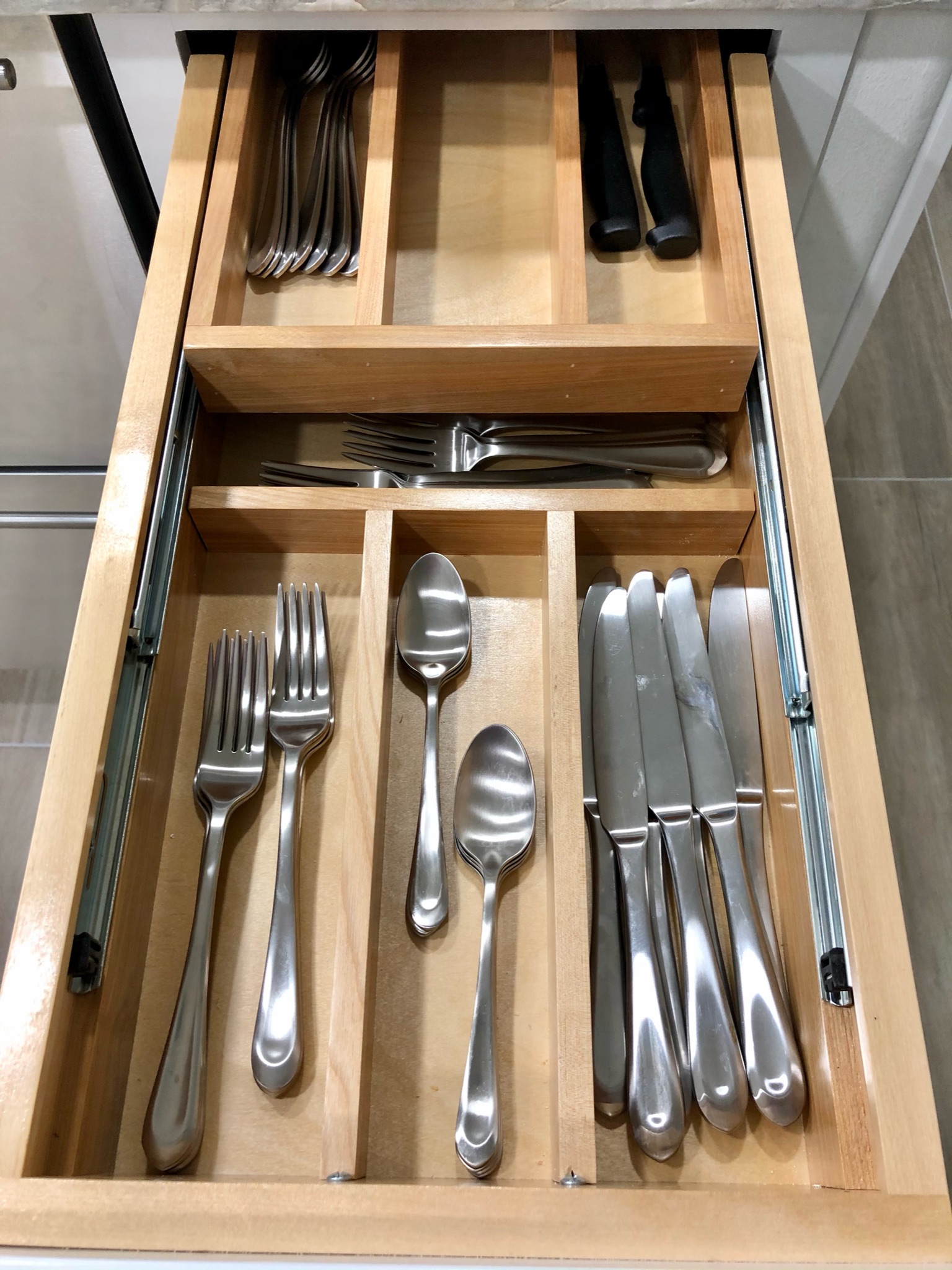 A custom cabinet drawer for storage, along with 4-customized pull-out drawers that were each designed to hold an entire Away Carry-on Suitcase for maximizing guest storage.
