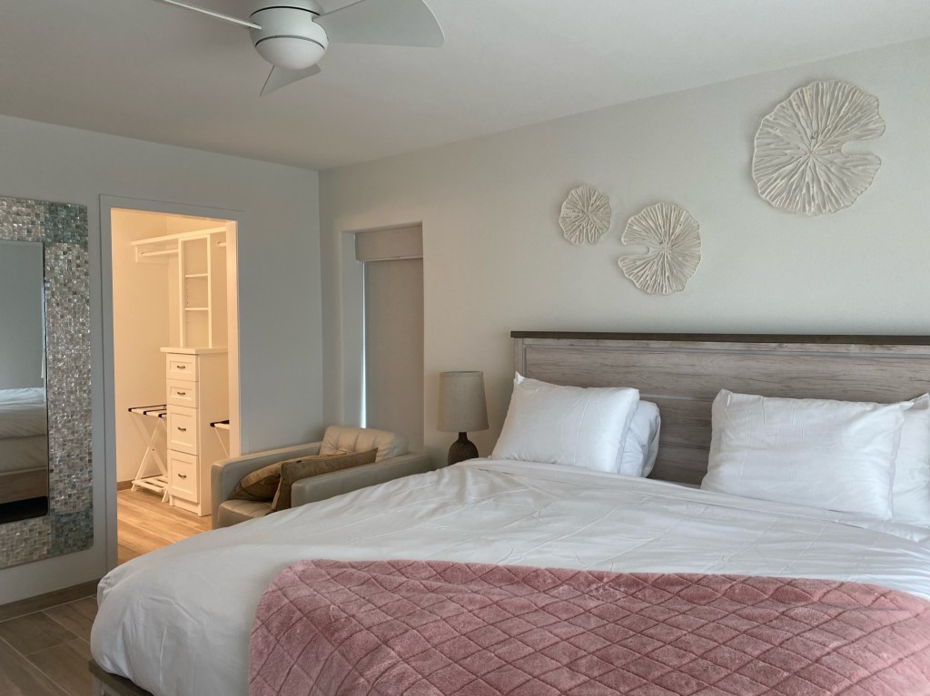 A beautiful, custom-tiled mirror accents the room with amenities include a 55″ LG Smart TV, ceiling fan, and nightstands include convenient USB and 110V plugs for easy access to plugging in your electronics. And you have a cozy, oversized, leather chair to relax with. You’ll have ample closet space with drawers for storage, luggage bench for your suitcases, and plenty of hanging space.