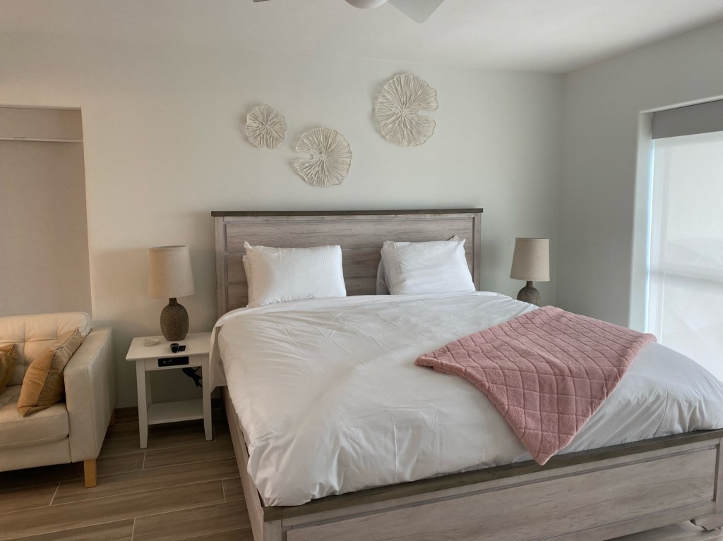 Refined living space with blue and yellow-accent colors. This is a spacious living room that reflects the beauty of the ocean featuring a picture window that looks out onto the beach. Your living room includes two movable side tables for storage. A gigantic 75″ LG Smart TV paired with the latest in Sonos Soundbar technology, that also syncs (via bluetooth) to your iPhone for your in-house music enjoyment.