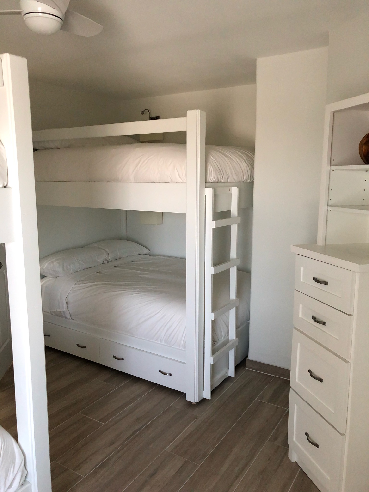 This isn’t your normal bunk bed. These are custom built-in bunk beds, each with a Full-sized Westin Heavenly Bed with Serta Pillows and an overstuffed, allergen-free, down-alternative duvet creating a cloud-like effect helping promote deep, restorative sleep. Your guests sleep also includes room-darkening shades.
